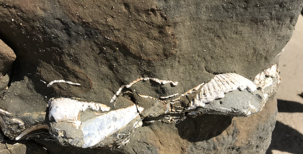 However, one rock specimen caught our eyes; it had the most unusual patterns in it. Upon closer inspection, we realized that these patterns were actually fossilized shells. The rocks contained an abundance of bivalves (clam-like shells) and snail shells of many different shapes and sizes. The rocks were smoothed and rounded from being tumbled in the surf. We first found smaller shell-containing rocks being deposited on the beach by the waves. We then found a pile of larger rocks up against the sea cliffs. This caused us to look up and were we ever surprised to find something very similar to what we had observed in the Grand Canyon - sandstone strata containing very distinct and flat layers of marine shells. We even found a sponge specimen almost identical to the ones we identified in the Kaibab formation.